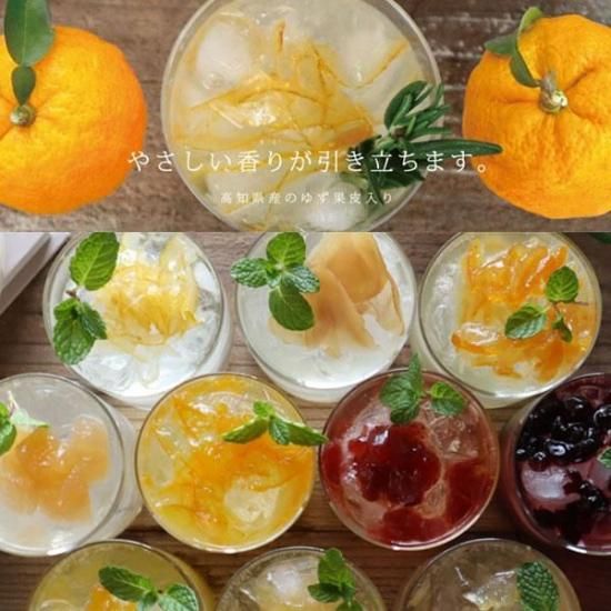 スライスされたゆずの果皮入りで、カットの異なる2種類のゆず(スライス・ダイスカット)を加えています。この果皮もおいしく召し上がれます。ゆずの食感をお楽しみください。